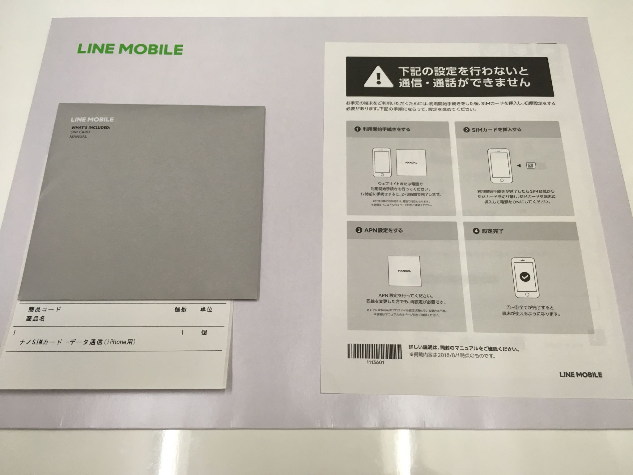 灰色の小封筒の中には、SIMカード、マニュアル、SIMの取り扱い注意事項が入っていました。