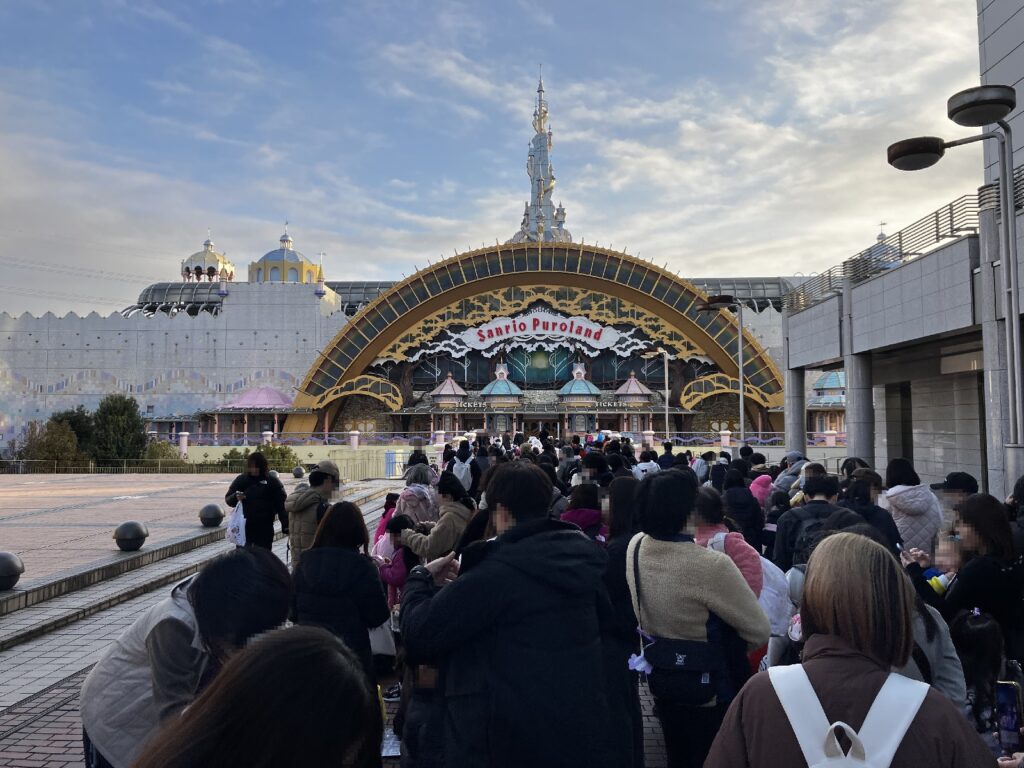 7:45頃に駐車場から3Fへのエレベータを上って、入口ゲート前のデッキ(ハローキティストリートというらしいです)の入場待ちの列へ。先頭から前のほうは敷物や椅子や防寒対策やサンリオグッズを身にまとったガチな方々がいらっしゃり、我々が並んだのはピューロランドを正面に見て右側に建物/左側に少しオープンなスペースがあるあたりで、目測では200~300人目くらいだったかと思います。