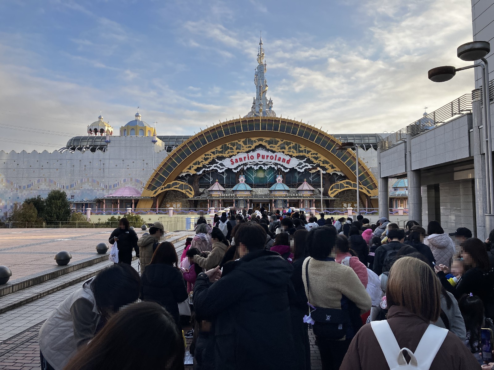 7:45頃に駐車場から3Fへのエレベータを上って、入口ゲート前のデッキ(ハローキティストリートというらしいです)の入場待ちの列へ。先頭から前のほうは敷物や椅子や防寒対策やサンリオグッズを身にまとったガチな方々がいらっしゃり、我々が並んだのはピューロランドを正面に見て右側に建物/左側に少しオープンなスペースがあるあたりで、目測では200~300人目くらいだったかと思います。